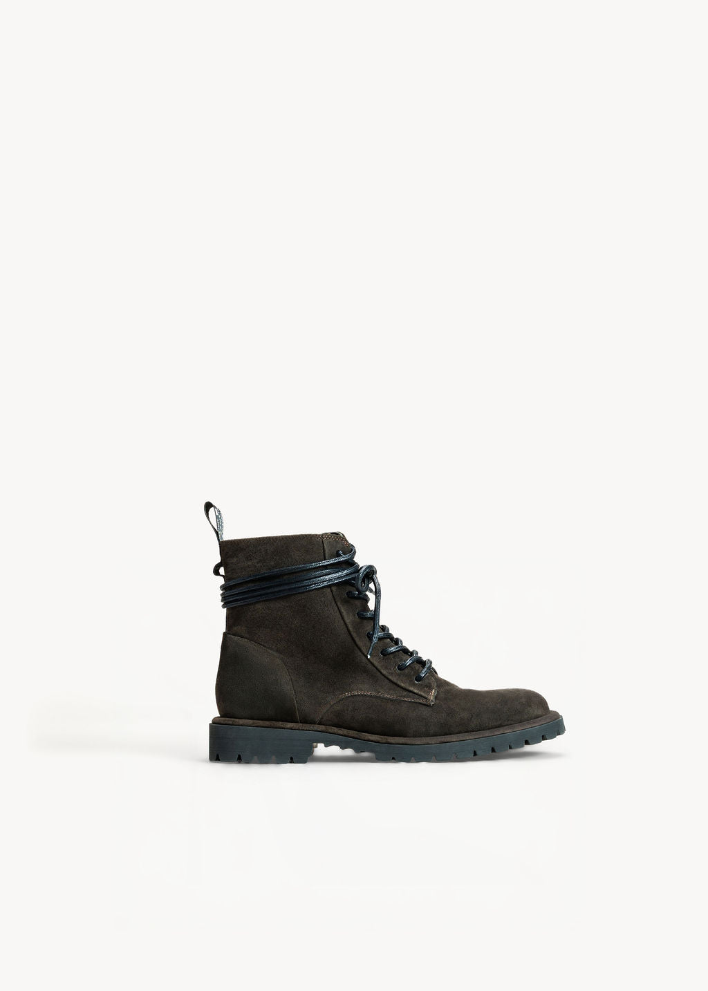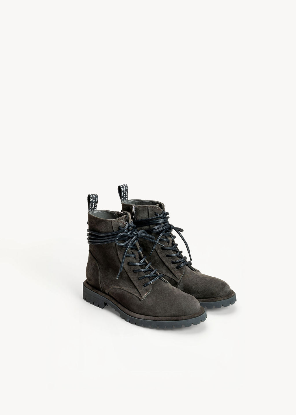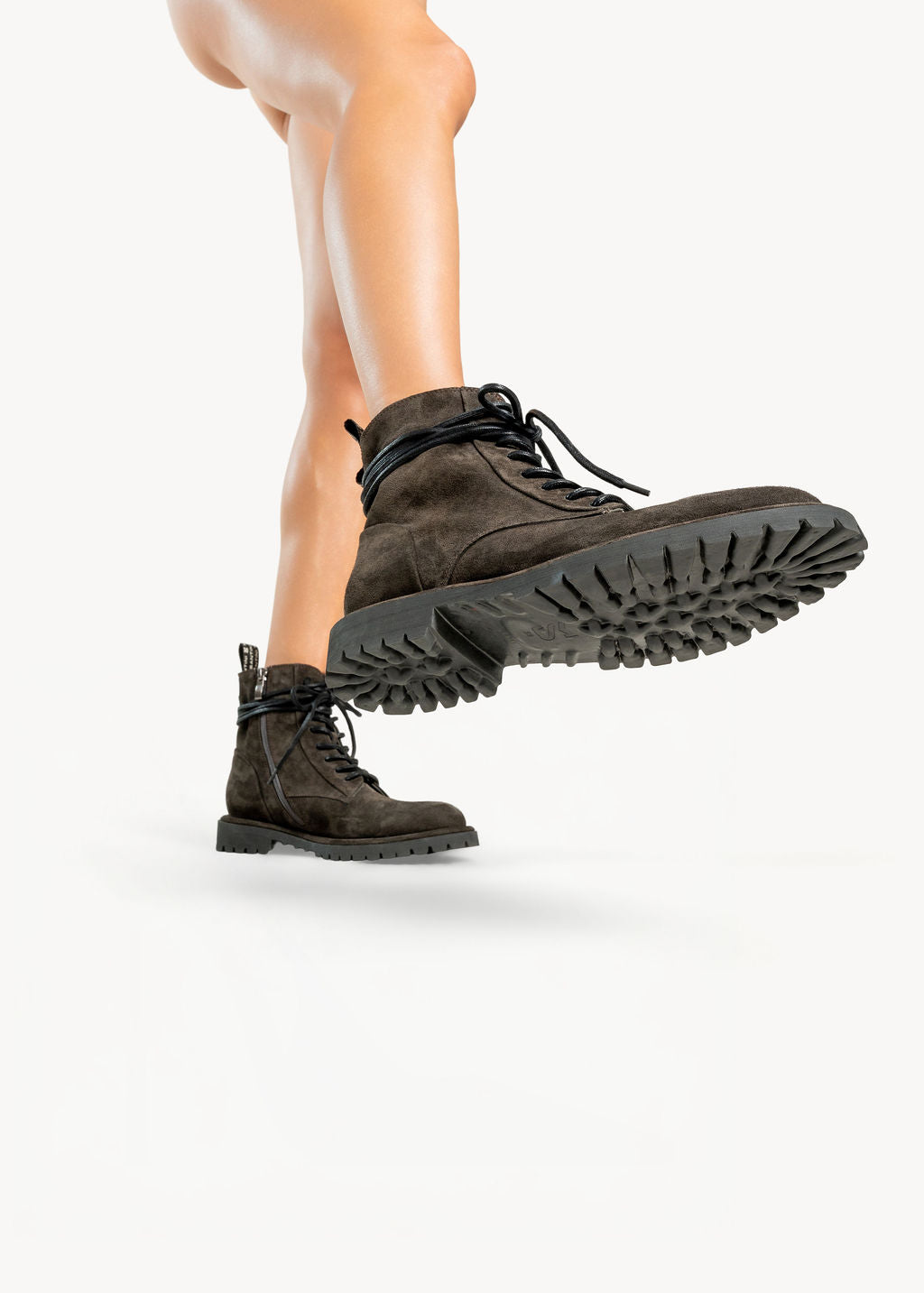 Stivaletto army in camoscio cerato dalla punta rotonda, silhouette rock e tacco 2 cm.