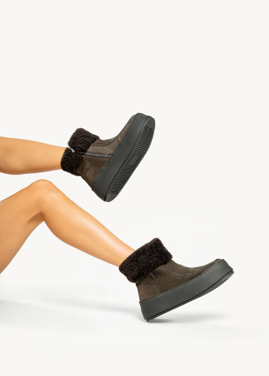 Stivaletto in suede army dalla punta rotonda, cavigliera in montone, fodera in panno caldo a tono e suola in gomma 5 cm.