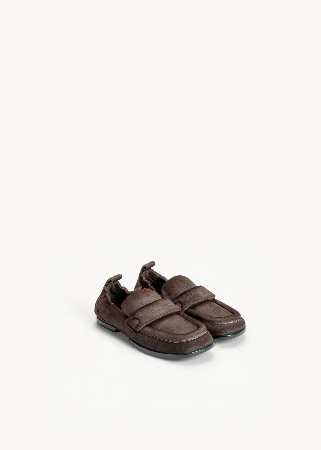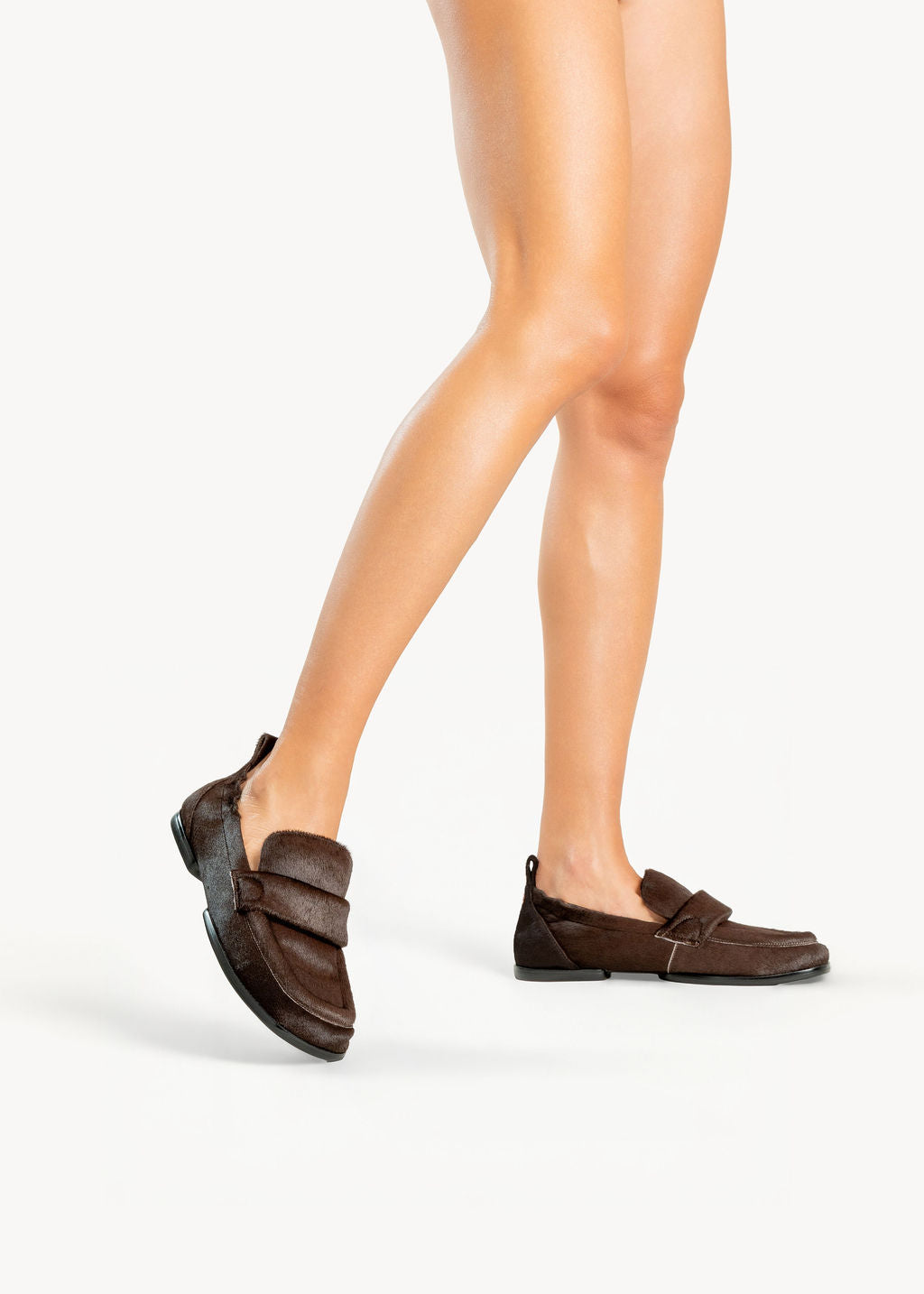 Mocassino in pony marrone espresso dalla forma squadrata con silhouette minimale e suola in gomma.
