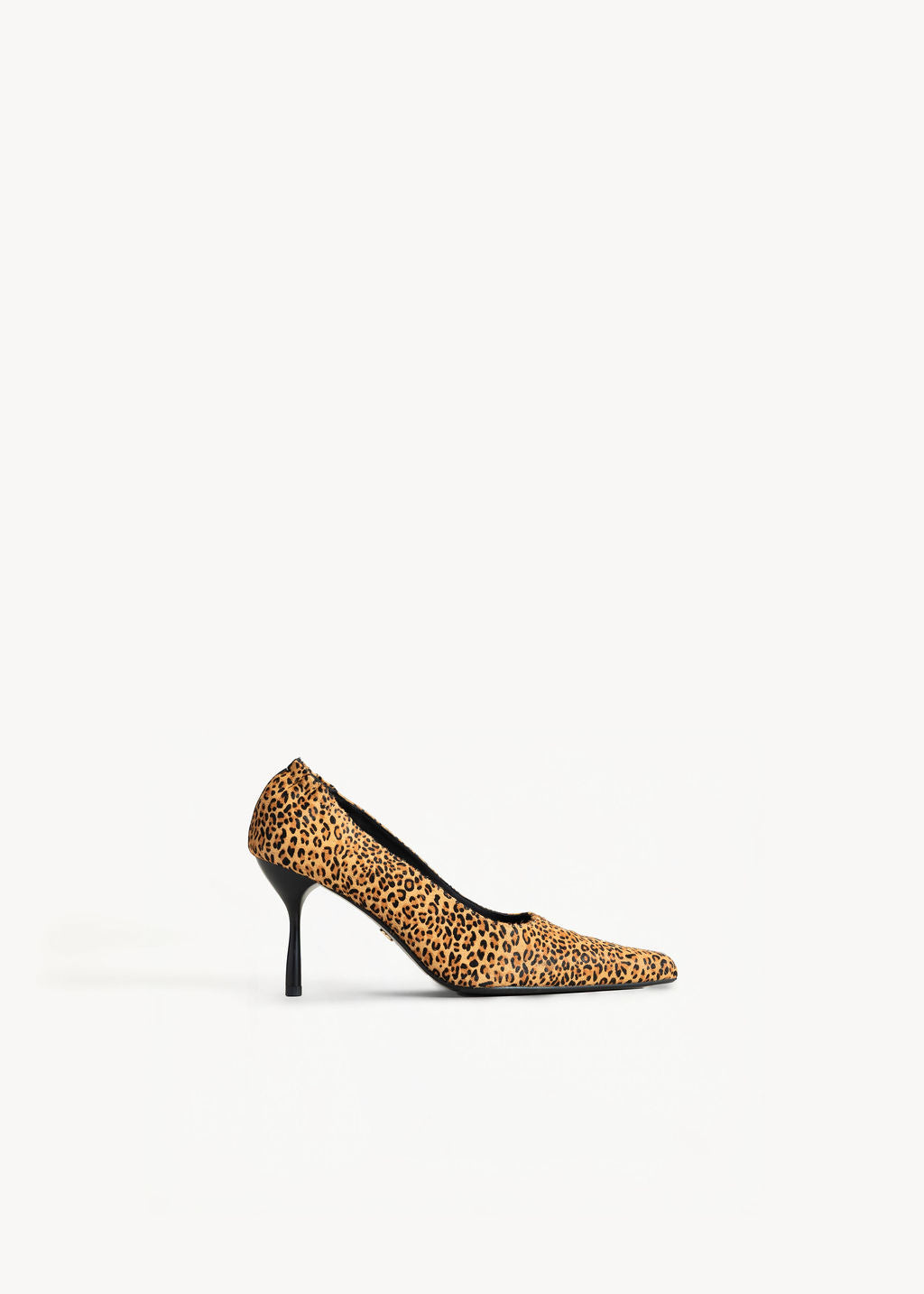Décolleté in cavallino con stampa leopardo con punta a mandorla e tacco. Soletta in pelle effetto seta ed elastico sul retro.