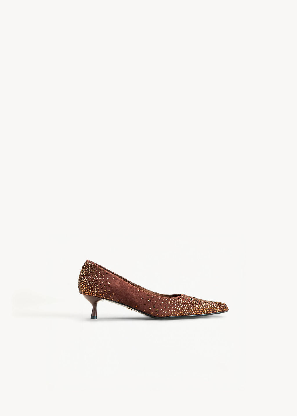 Espresso slingback pumps with spool heel and almond toe. Silk-touch leather insole. Degradè crystals.