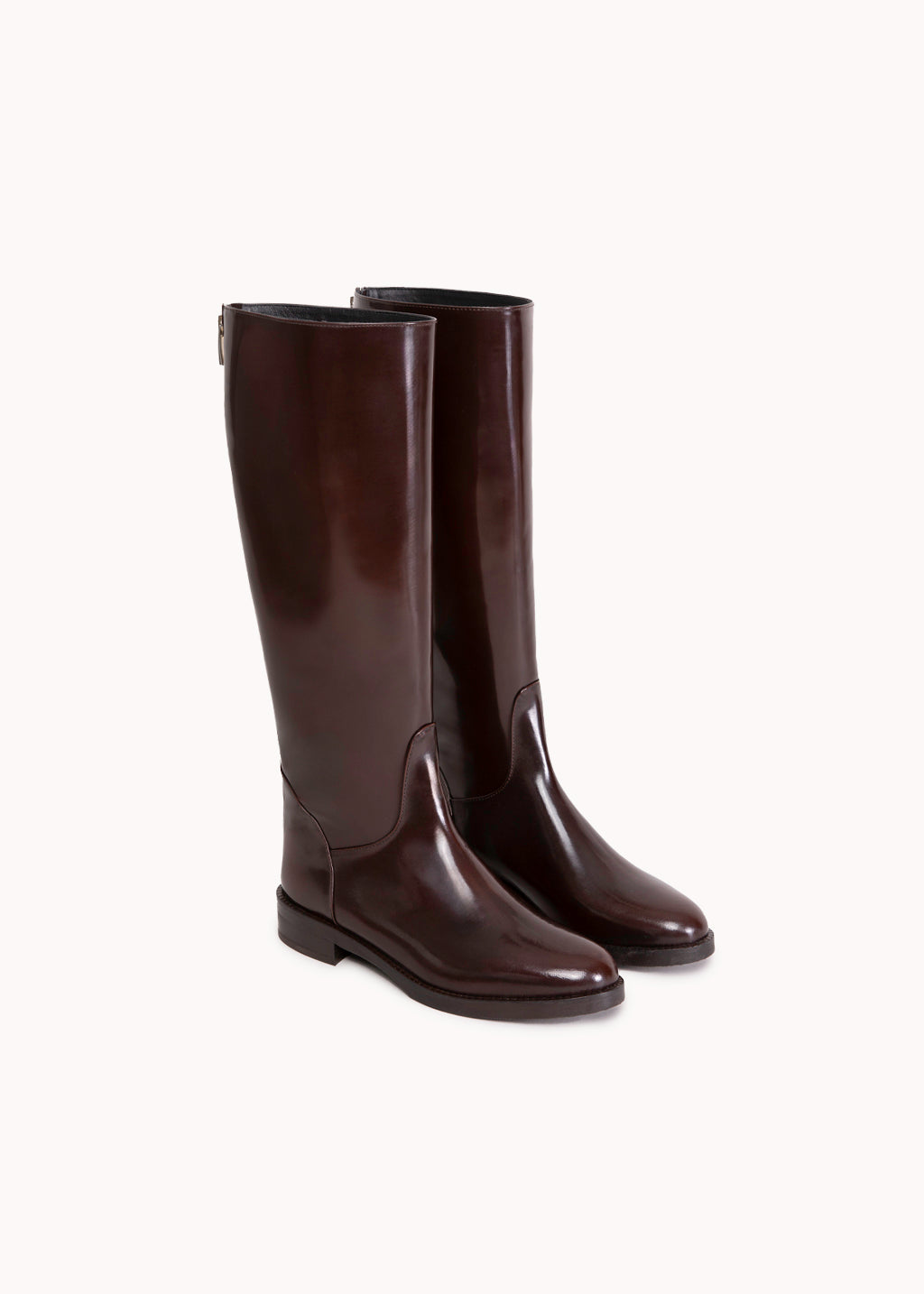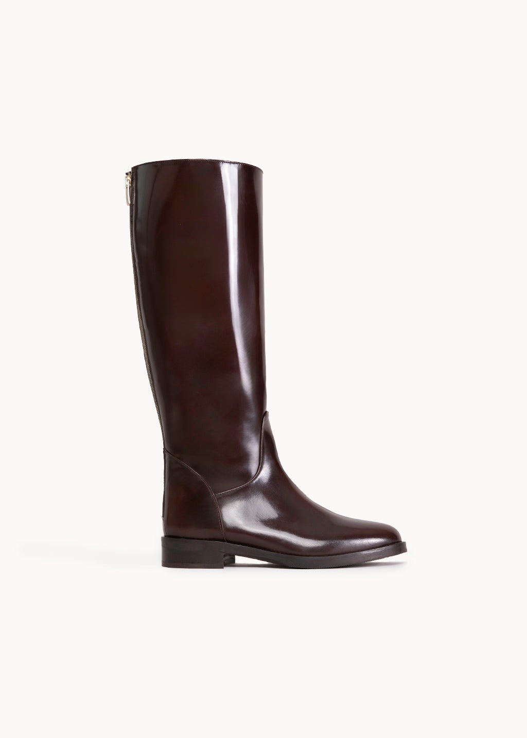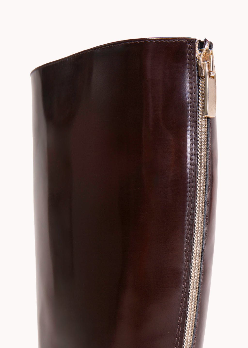 Stivale cavallerizzo espresso abrasivato con suola in gomma espresso, tacco 3 cm e zip a vista oro sul retro.